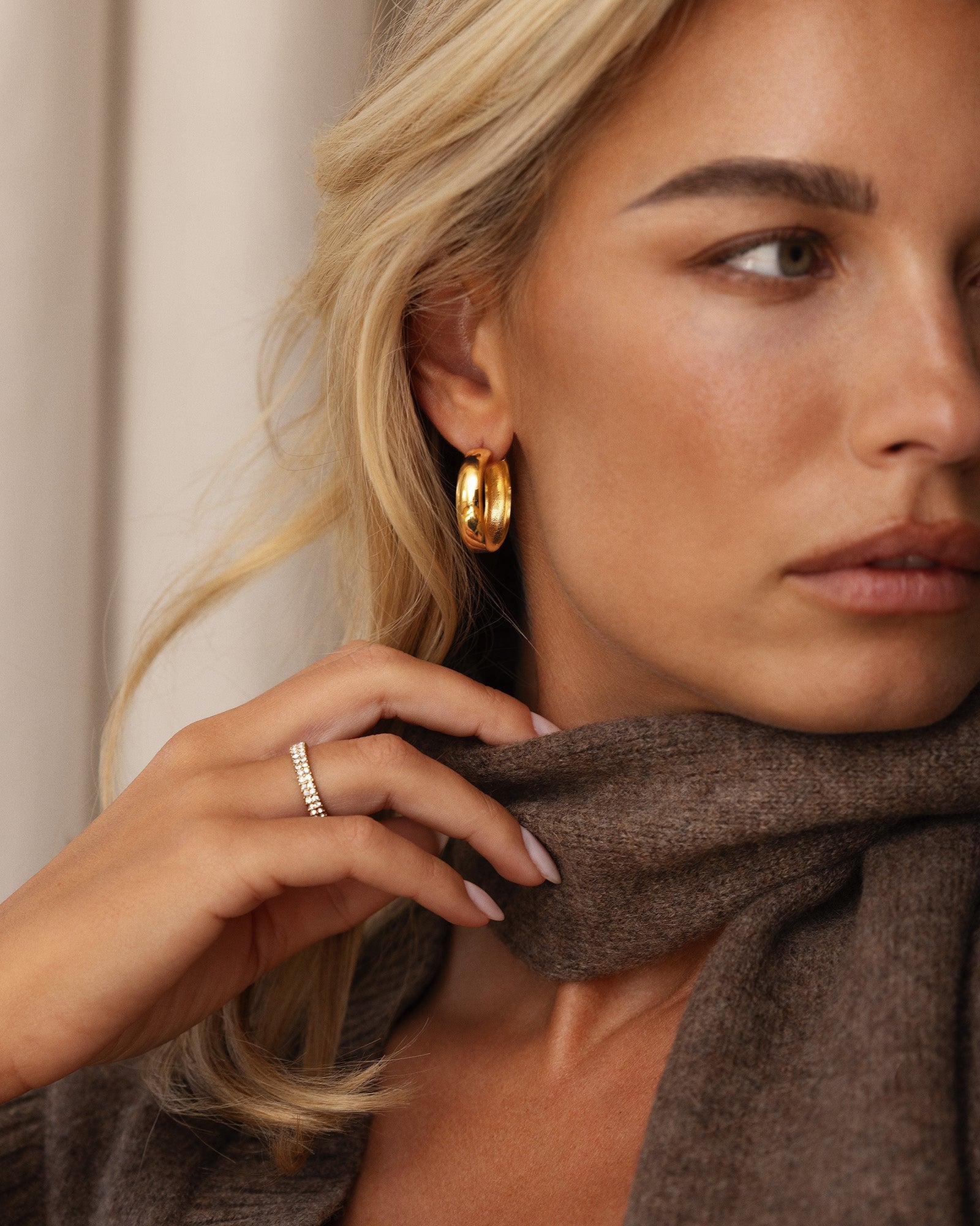Los Aros Brave Large en acabado de tono dorado presentan un diseño suavemente abovedado y compacto que se asienta cerca de la oreja. Fabricados en acero inoxidable chapado con oro 18K mediante tecnología PVD, conservan su brillo con el uso diario. Úsalos solos para un look limpio o combínalos con pendientes más pequeños para un toque personal.