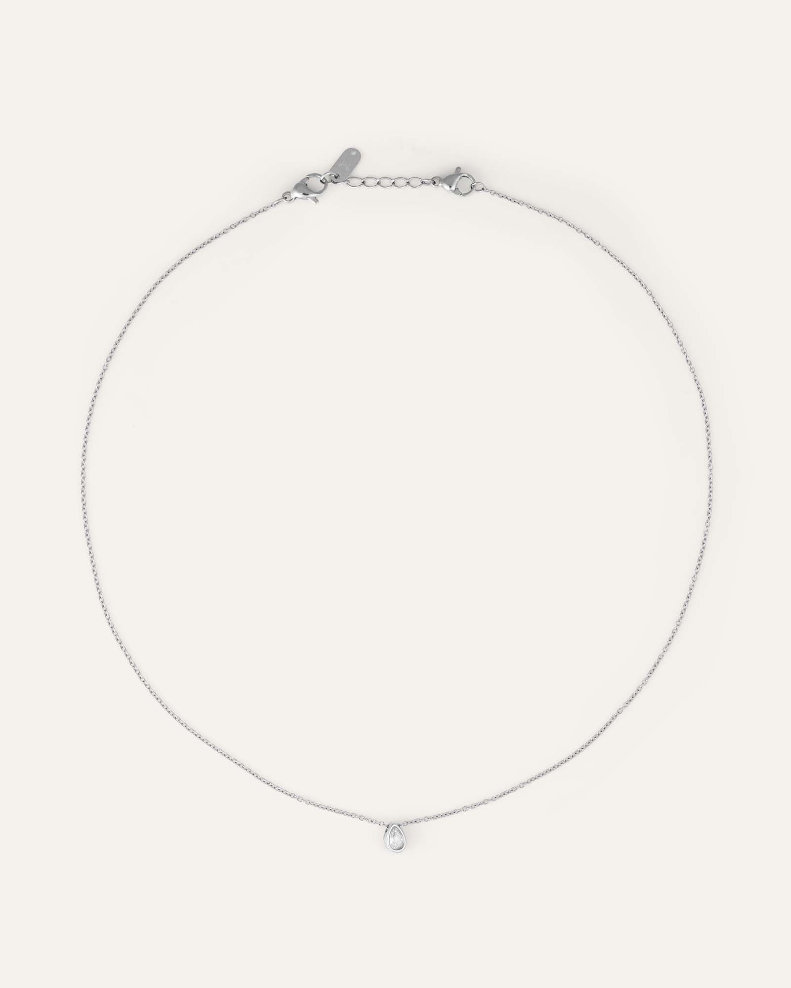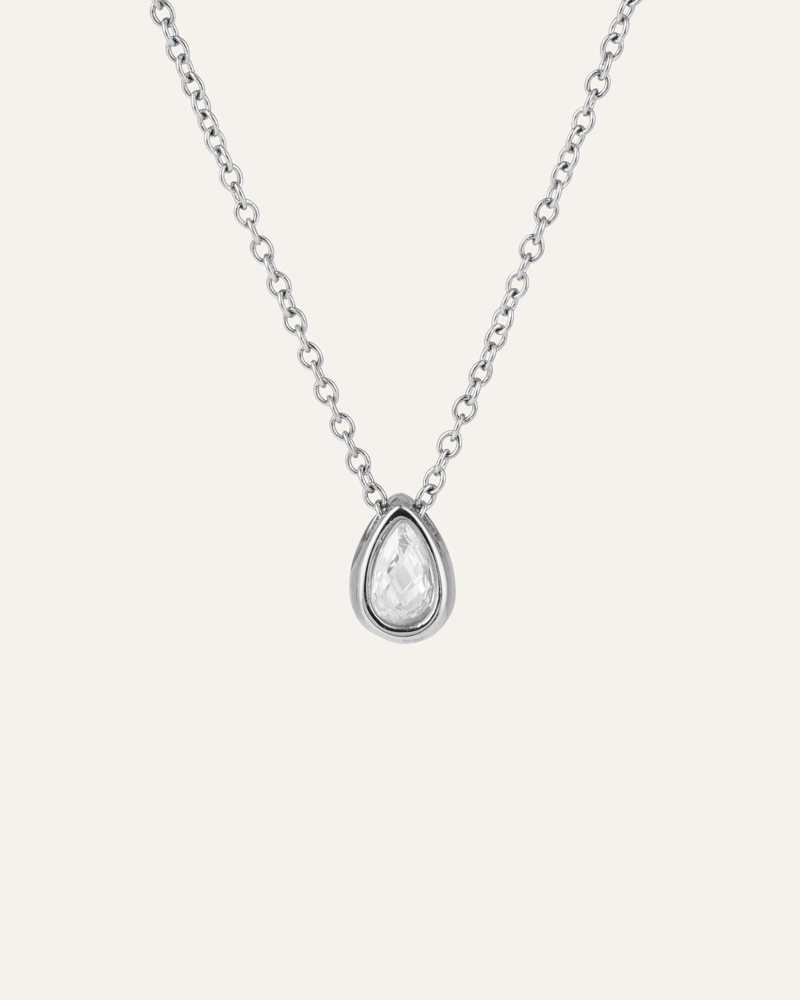 Una gota brillante de claridad escandinava: acero inoxidable pulido con una circonia cúbica blanca que descansa cerca de la piel. Resistente al agua por diseño.