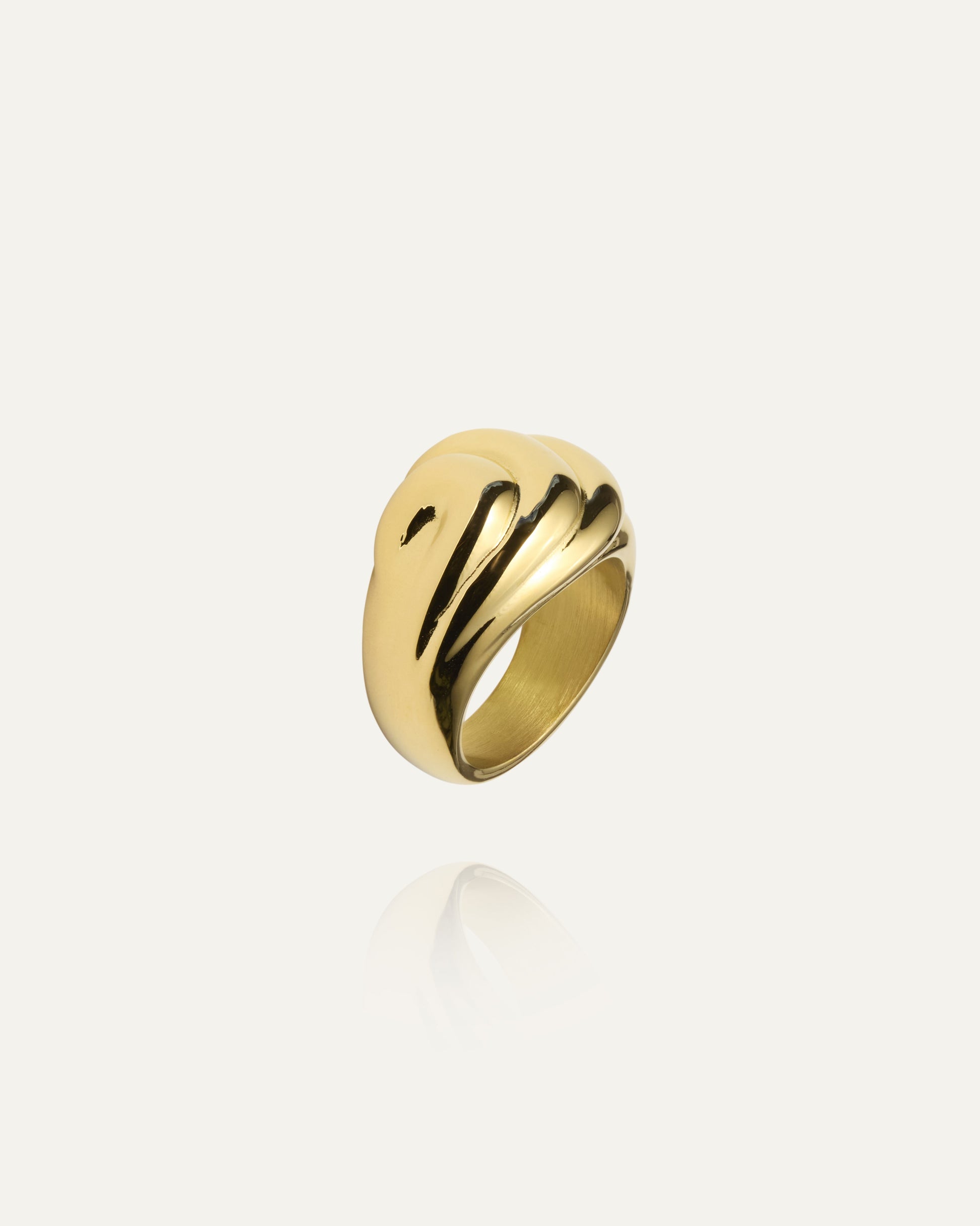 El Anillo Deco Bold tiene una superficie esculpida y ondulada que le da una expresión dinámica. Fabricado en acero inoxidable sólido con baño PVD duradero de oro de 18K, es resistente al agua y duradero. Llévalo todos los días: nada, ducha y entrena sin preocuparte de que pierda su color.