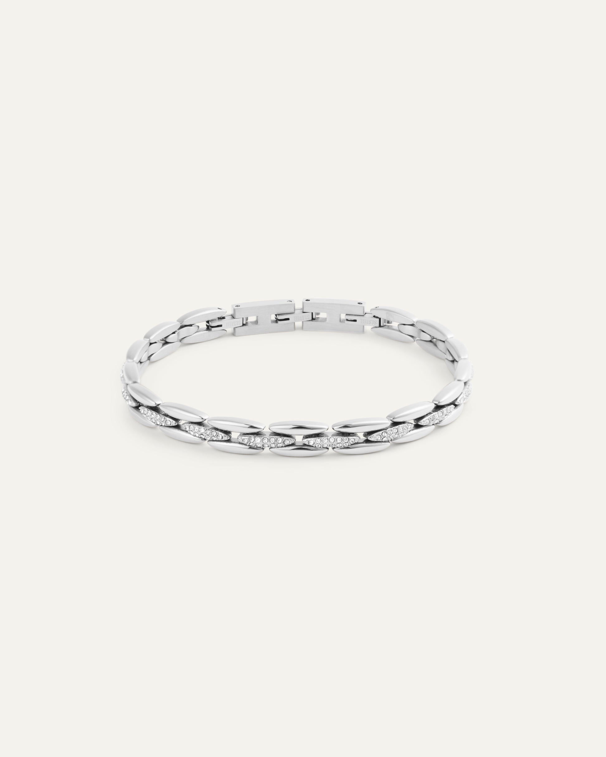 Pulsera de cadena con formas suaves entrelazadas donde las secciones lisas se encuentran con piedras Preciosa blancas engastadas con pavé. El color plateado ofrece un look fresco y refinado: igual de hermoso solo que combinado con un reloj. Ajuste ajustable con longitud extra para comodidad todo el día.