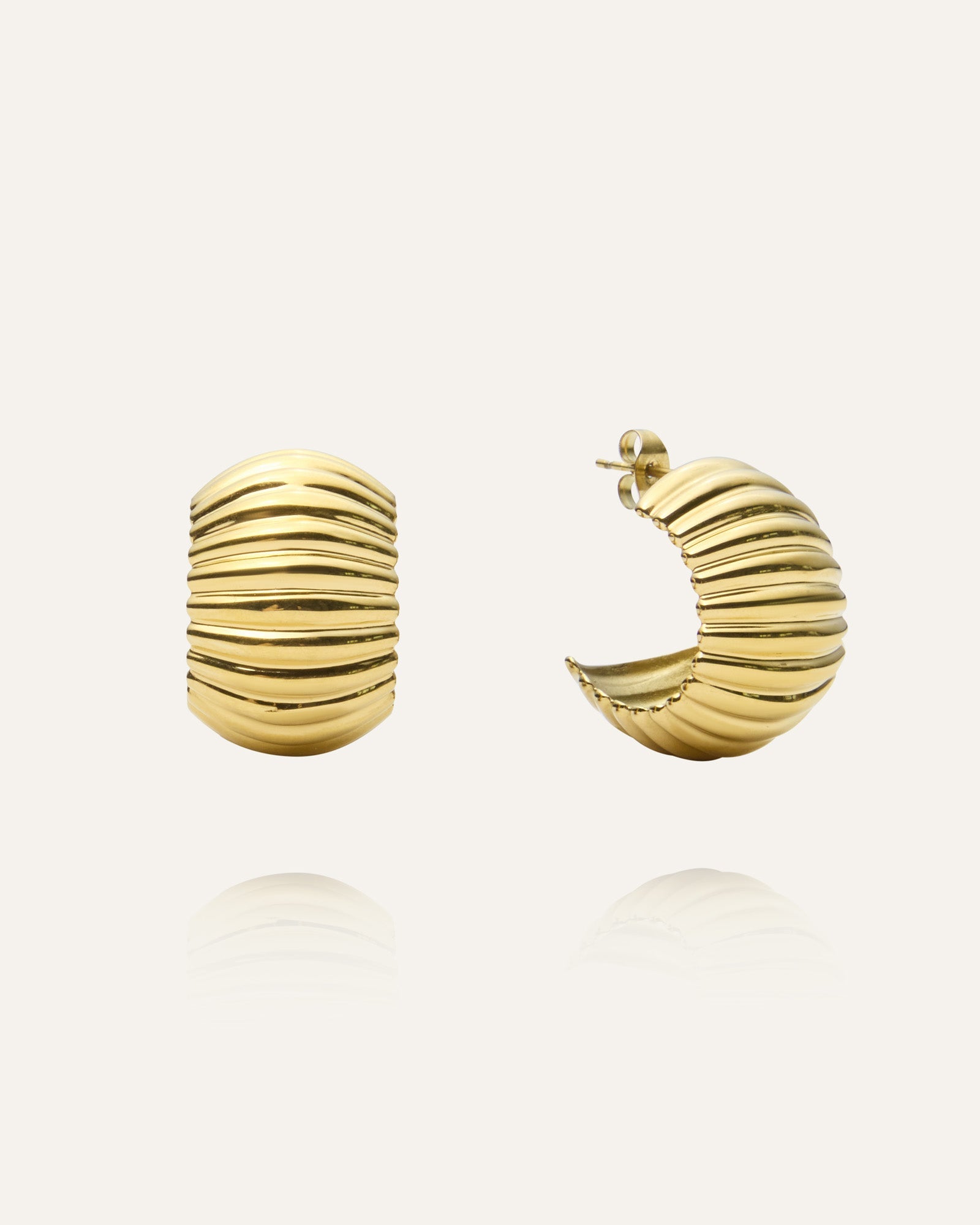 Los Pendientes Karin son aros llamativos con un patrón acanalado clásico, perfectamente combinados con el Anillo Henriette.