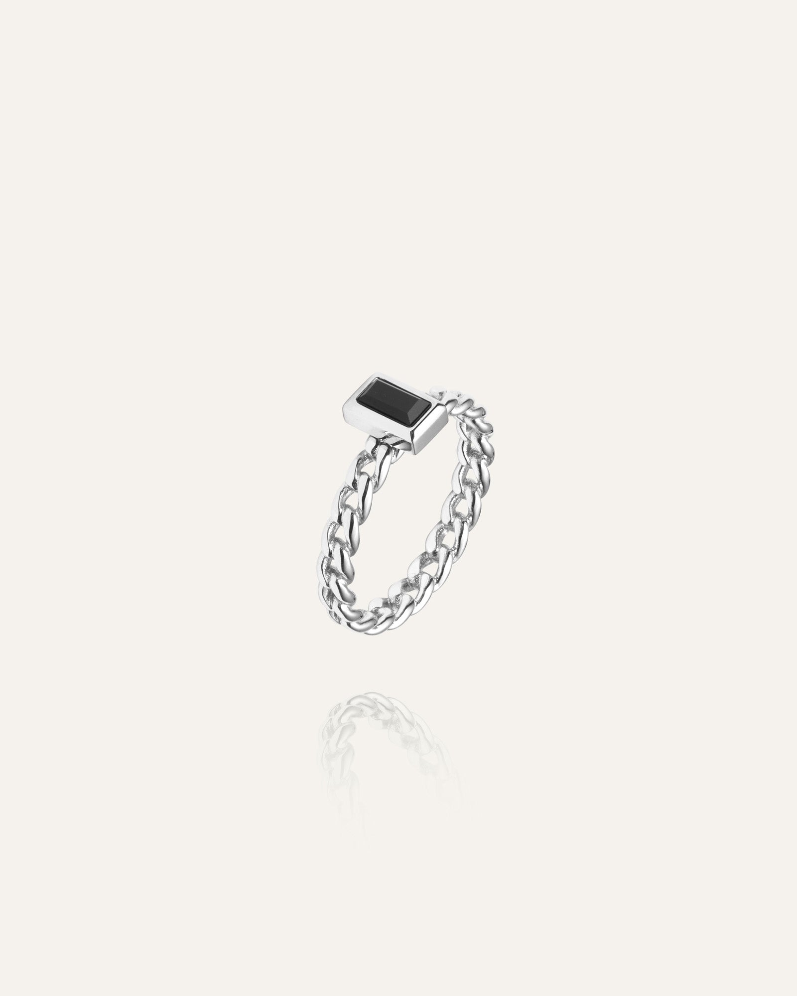 El Anillo Karolina tiene un diseño de eslabones de cadena y está adornado con una piedra negra rectangular engastada en un marco de color plateado.