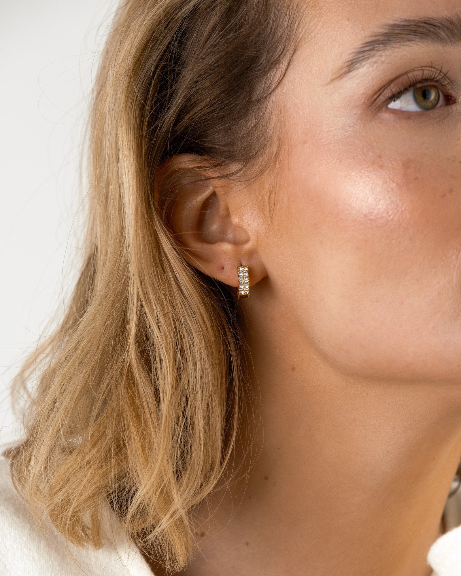 Elegantes aros con brillantes piedras de circonita cúbica. Hechos de acero inoxidable macizo con baño de oro PVD de 18K, son duraderos y resistentes al agua, asegurando que conservan su color y estilo con el tiempo. Combínalos con nuestro anillo Midnight para un look completo.