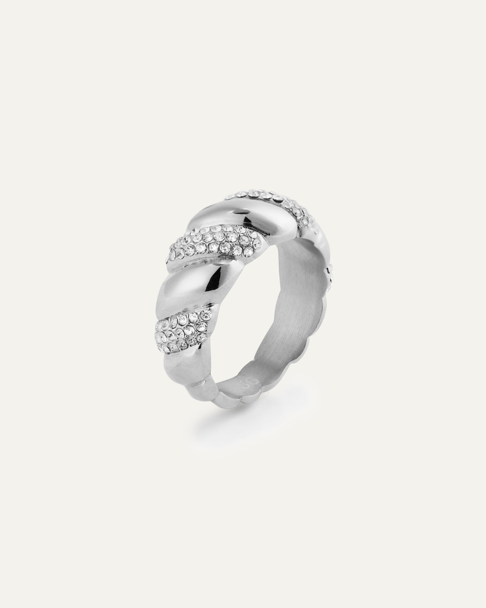 Perfil suavemente retorcido donde el metal liso se encuentra con piedras Preciosa blancas engastadas con pavé: una pequeña declaración que se siente adecuada cada día. El acabado plateado ofrece un look fresco y definido y se combina fácilmente con tus piezas favoritas. Úsalo solo para una línea limpia o apilado para más brillo.