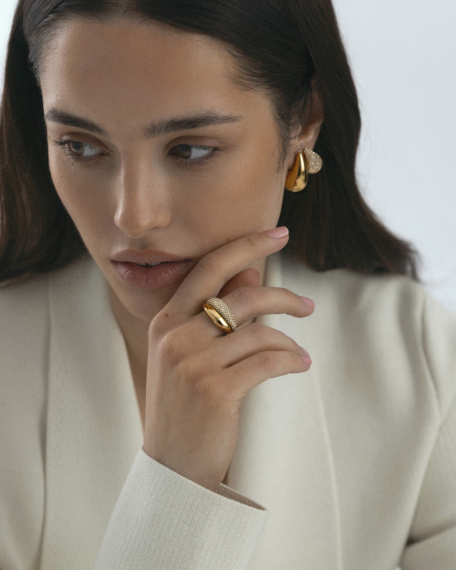 El Anillo Pavé Daring tiene un diseño asimétrico único donde la mitad del anillo está adornada con brillantes piedras de circonita cúbica, mientras que la otra mitad presenta una superficie lisa y pulida. Hecho de acero inoxidable macizo con baño de oro PVD de 18K, es resistente al agua y duradero. Llévalo todos los días: nada, dúchate y entrena sin preocuparte de que pierda su color.