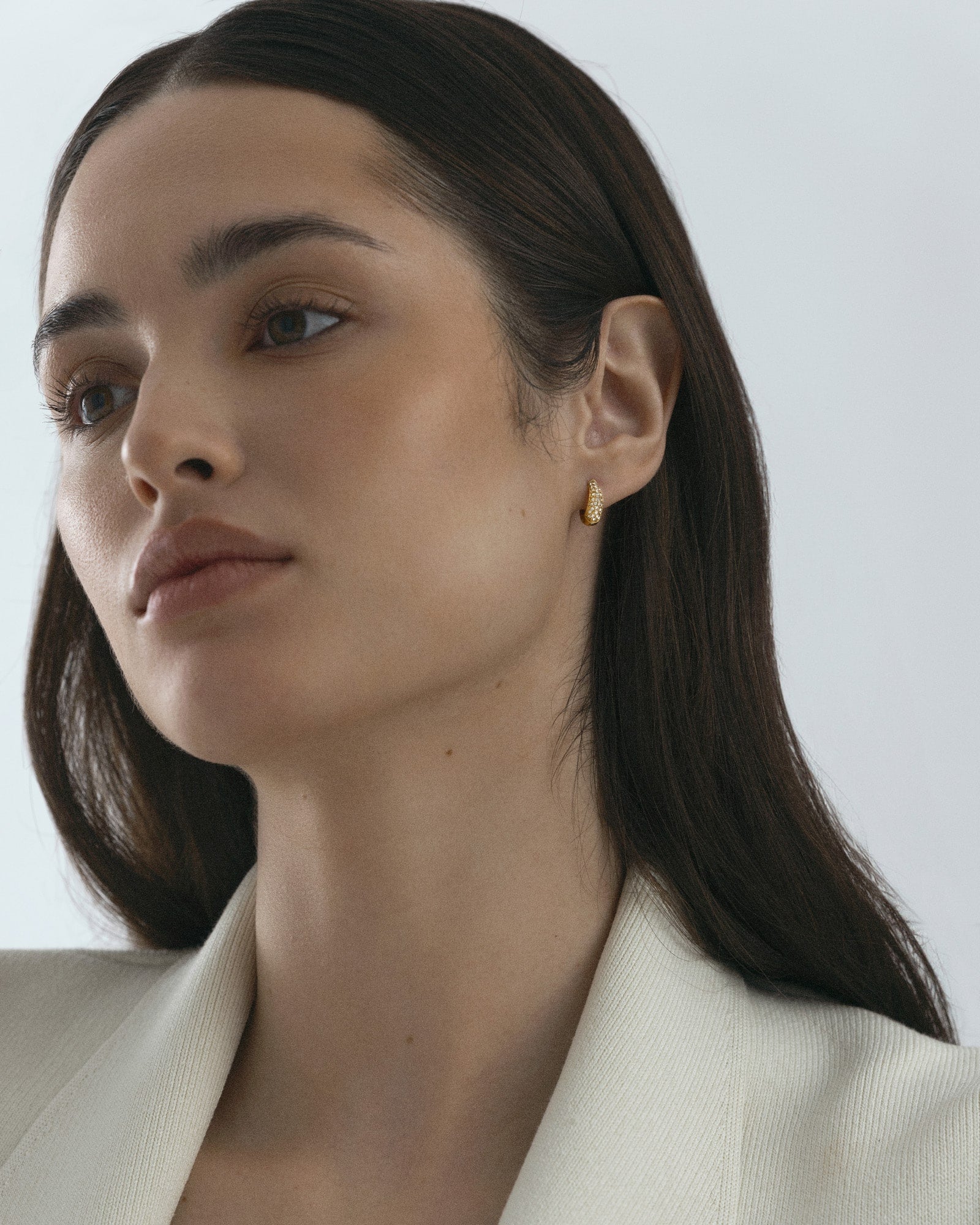 Discretos en tamaño, máximos en elegancia. Los Aros Pavé Precious están adornados con brillantes piedras de circonita cúbica y fabricados en acero inoxidable con baño de oro PVD de 18K. Duraderos y resistentes al agua para asegurar que conservan su color y brillo con el tiempo.