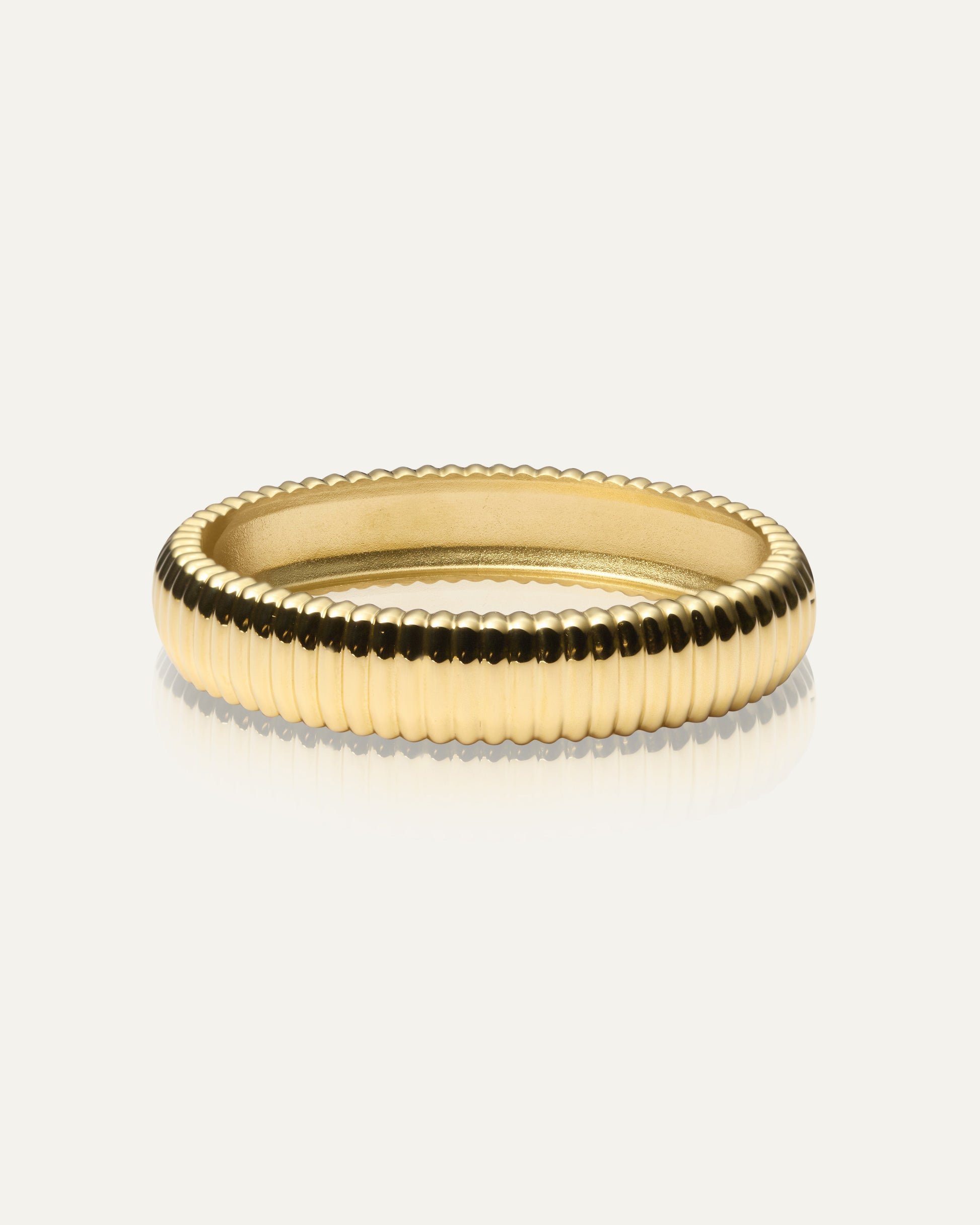 Una pulsera elegante con un diseño acanalado. La pulsera tiene 13 mm de ancho y un cierre de clic para facilitar su colocación y extracción. Fabricada en acero inoxidable con baño PVD de oro de 18K, es duradera y resistente al agua, garantizando que conserve su color y brillo con el tiempo.