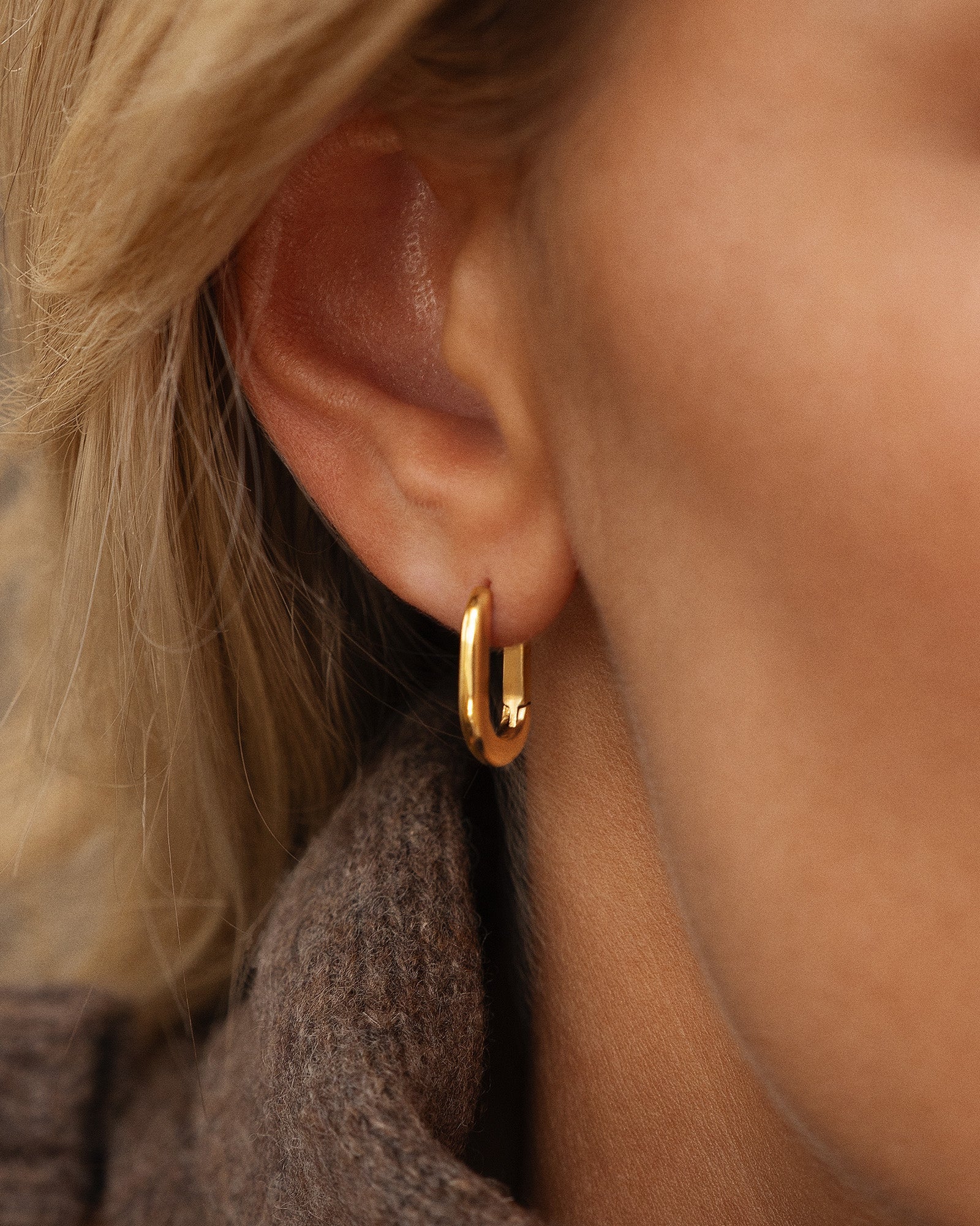 Los Aros Slim U-Hoops brillan con un tono dorado cálido. La forma de U delgada con líneas suavemente redondeadas ofrece un look limpio y atemporal que es fácil de usar y estilizar: de día a noche.