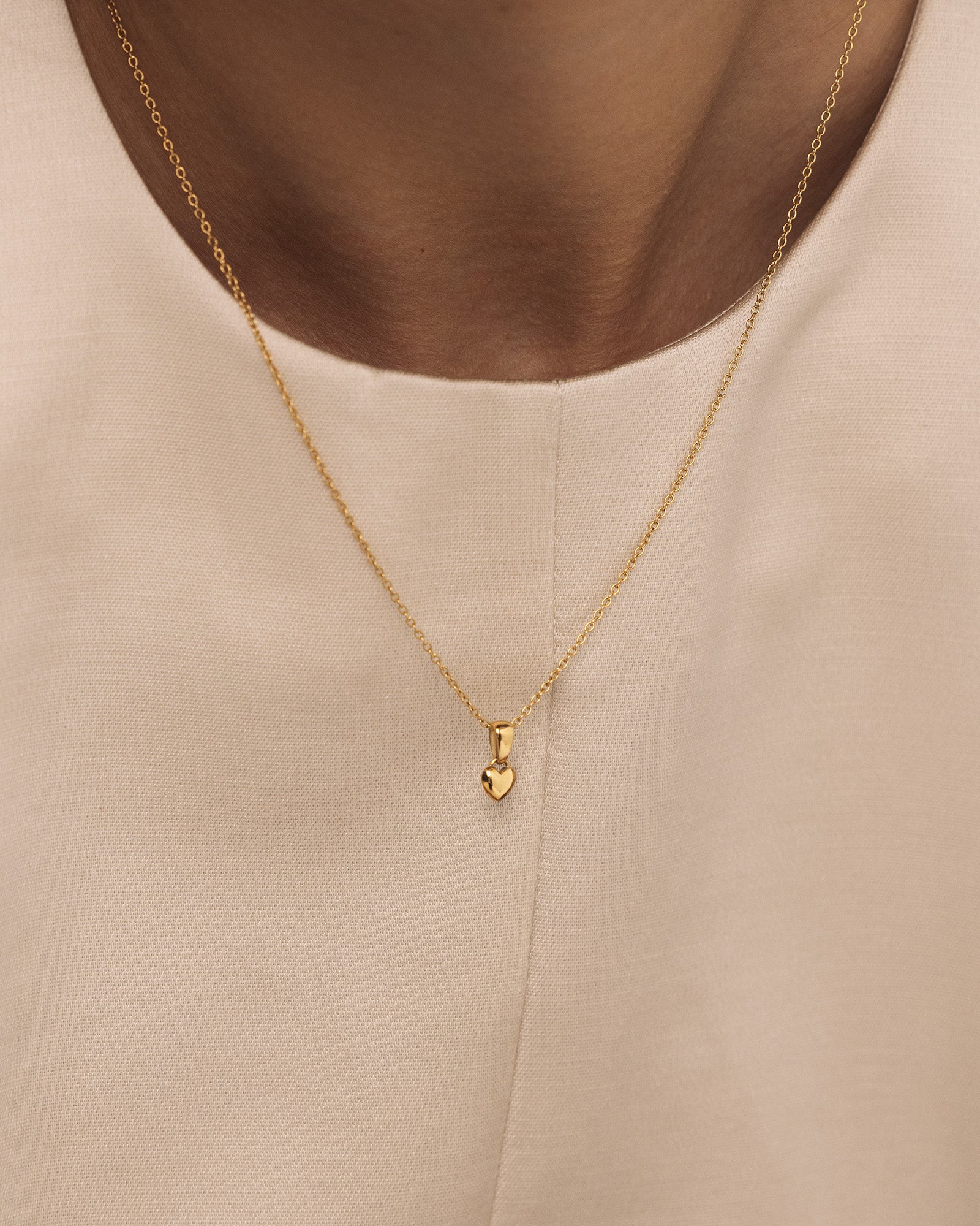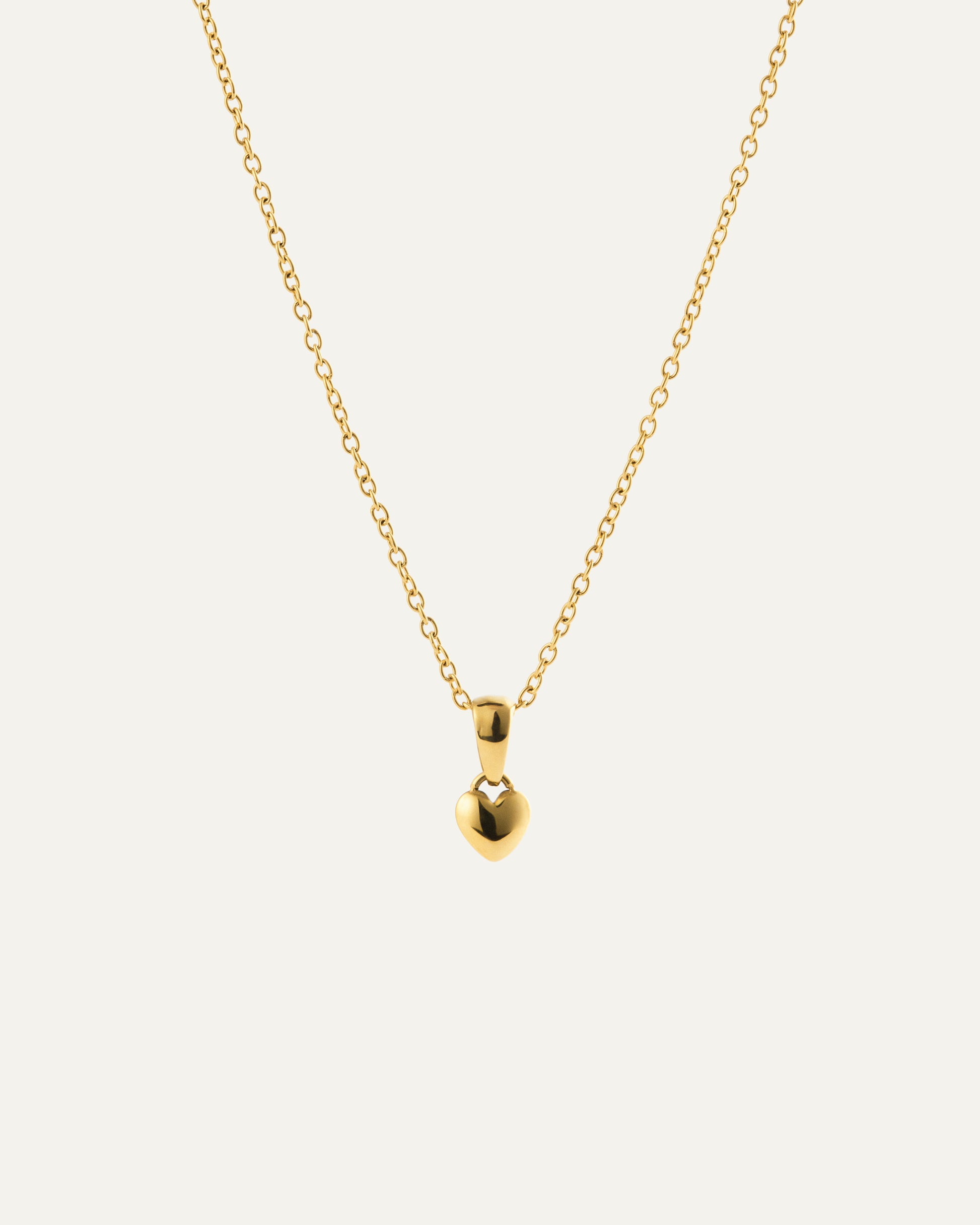 Un collar delicado chapado en oro con un pequeño colgante de corazón. Su diseño limpio y moderno lo convierte en un símbolo atemporal del amor, perfecto para la elegancia cotidiana.