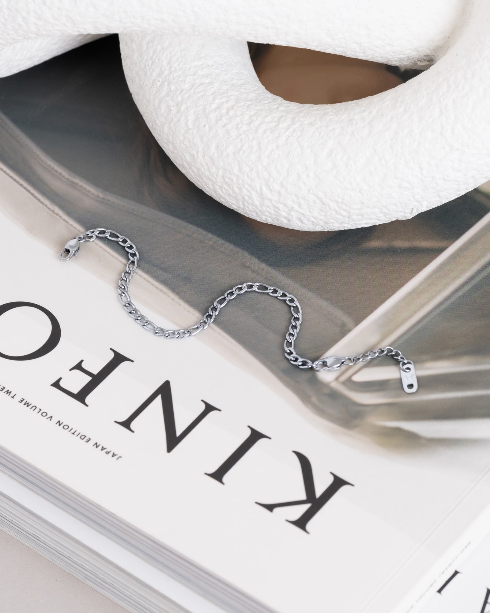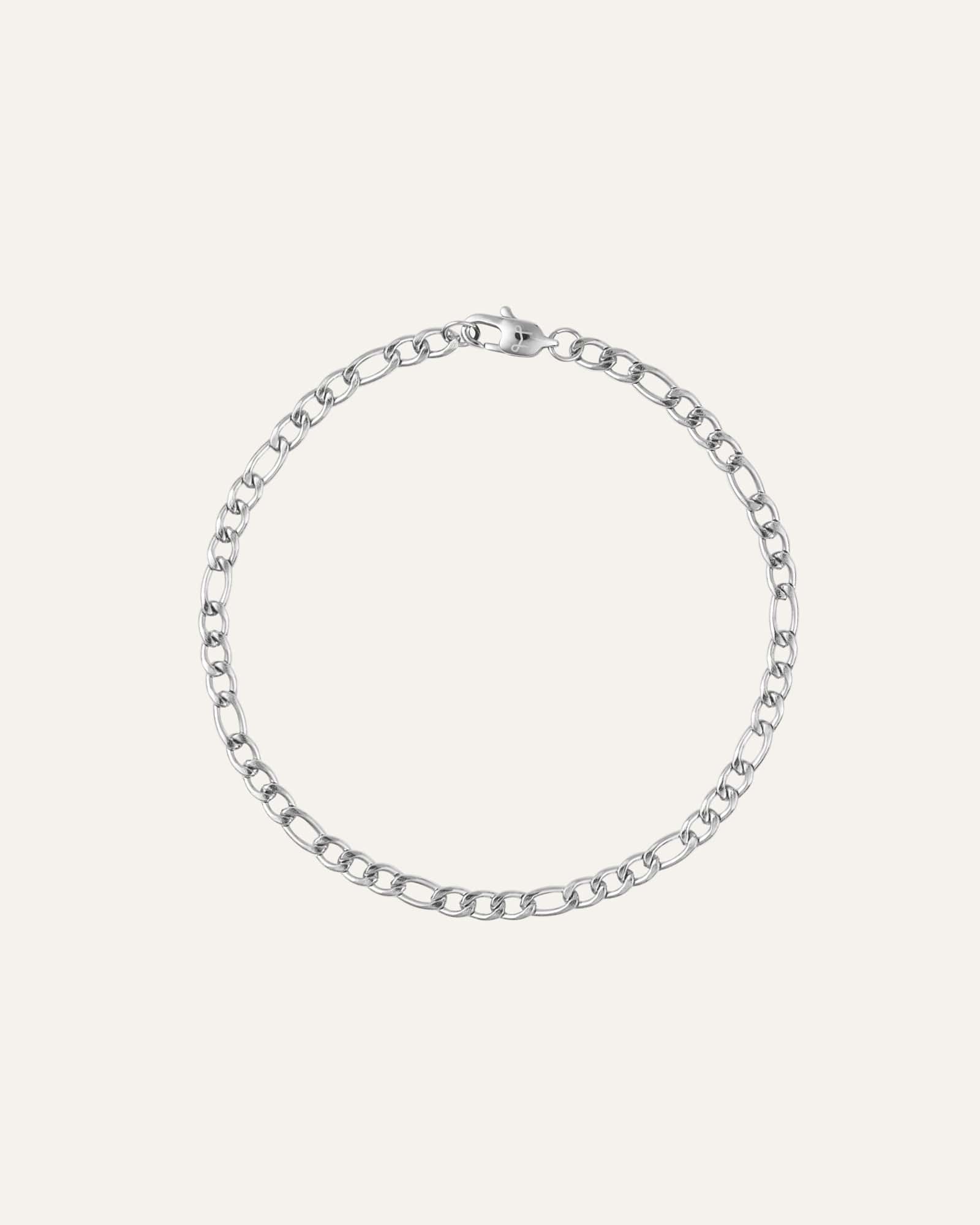 Figaro Bracelet es una pulsera con un diseño de eslabones clásico, perfecta para cualquier ocasión. Llévala sola o combínala con el collar Figaro para un estilo cohesivo. Hecha de acero inoxidable con baño PVD, es duradera y resistente al agua, asegurando que conserva su color y brillo con el tiempo. La cadena de extensión se puede quitar fácilmente para un ajuste personalizado.