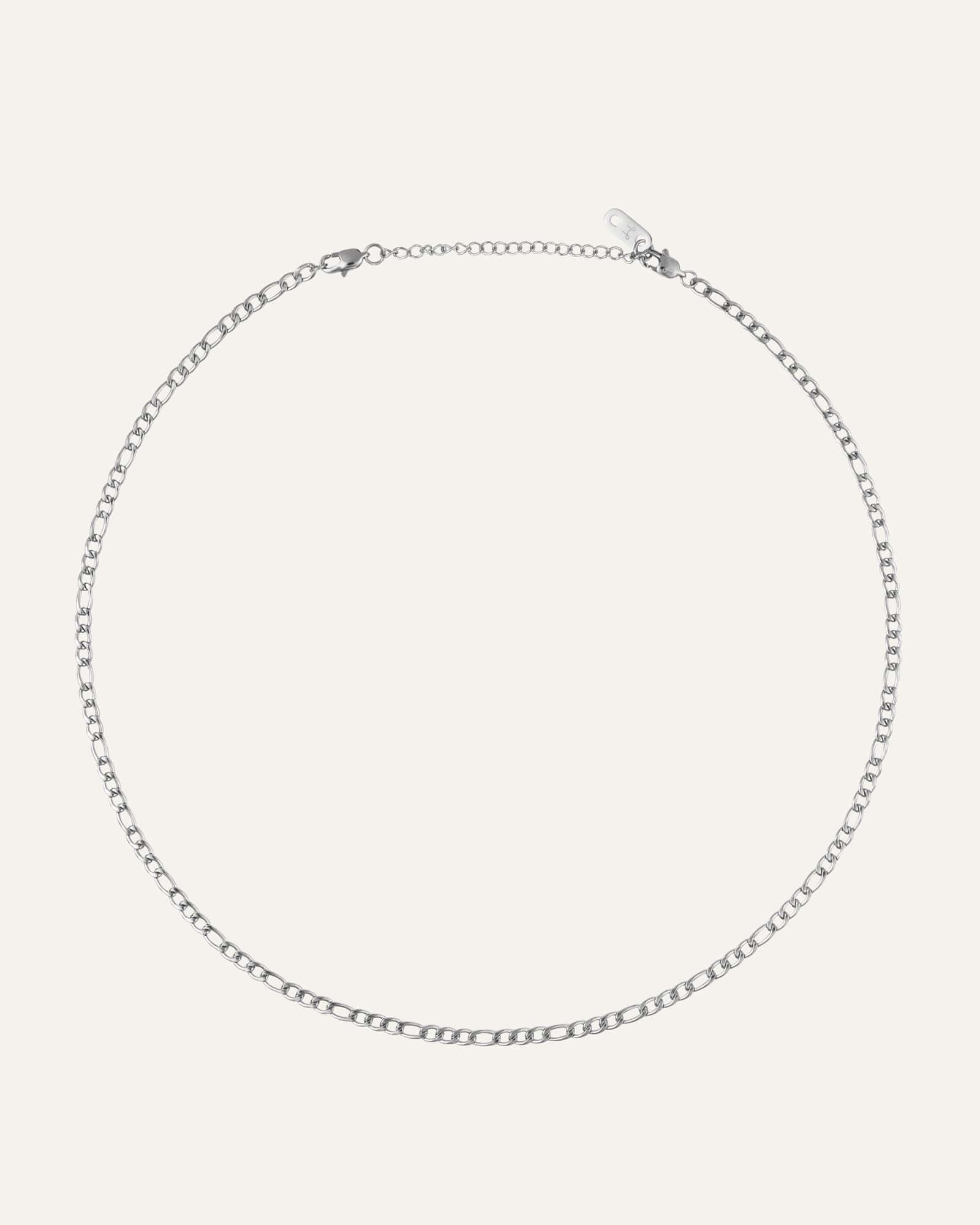 Figaro Necklace es un collar con un diseño de eslabones clásico. Combínalo con la pulsera Figaro para un look elegante y coordinado. Hecho de acero inoxidable con baño PVD, es duradero y resistente al agua, asegurando que conserva su color y brillo con el tiempo. La cadena de extensión se puede quitar fácilmente para un ajuste personalizado.