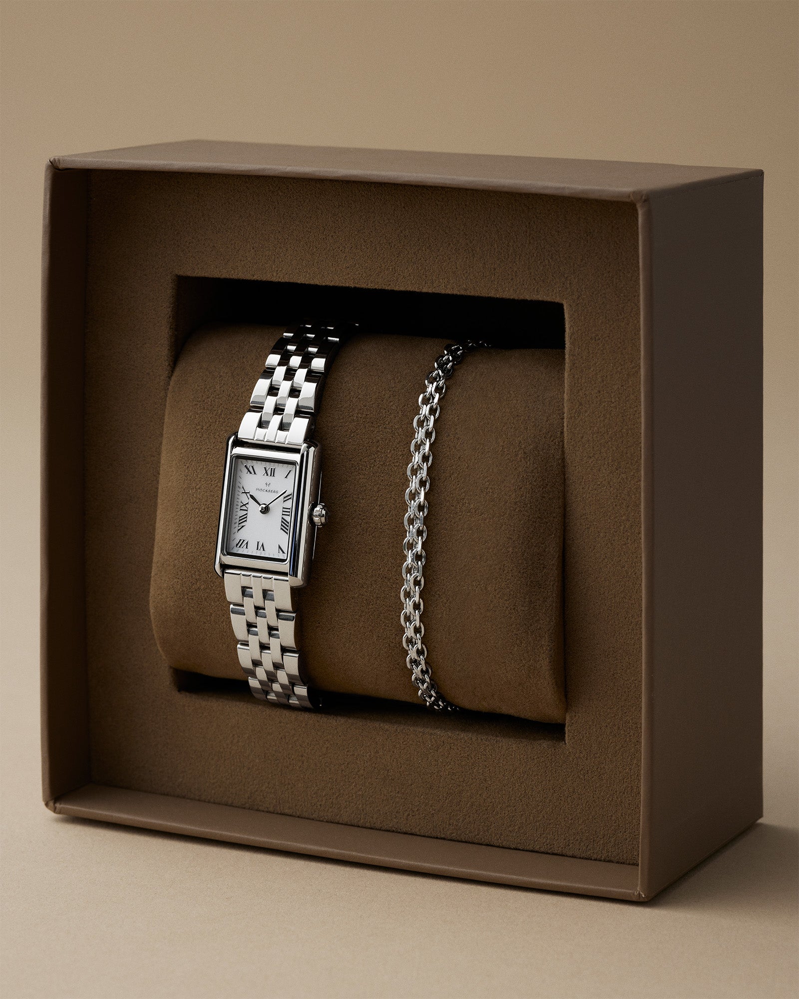 Preciosa caja combo con nuestro reloj bestseller Timeless y la pulsera Darling. La combinación crea el look clásico perfecto que se adapta tanto al día a día como a ocasiones especiales. El reloj y la pulsera vienen en una preciosa caja, ¡lo que hace de este el regalo de Navidad definitivo para alguien que amas!