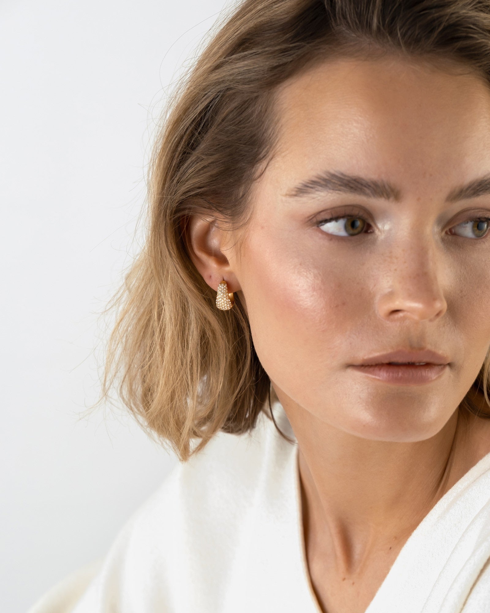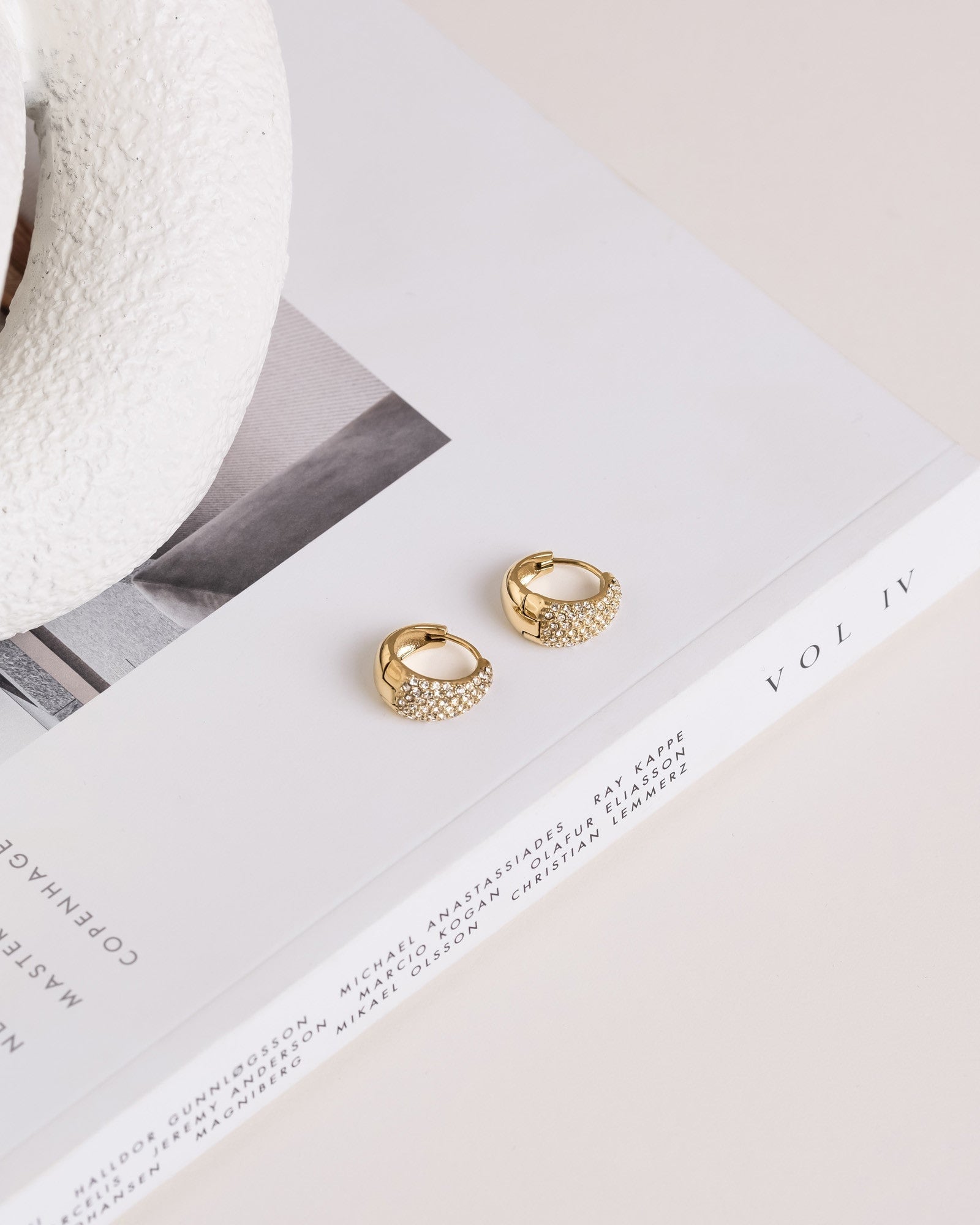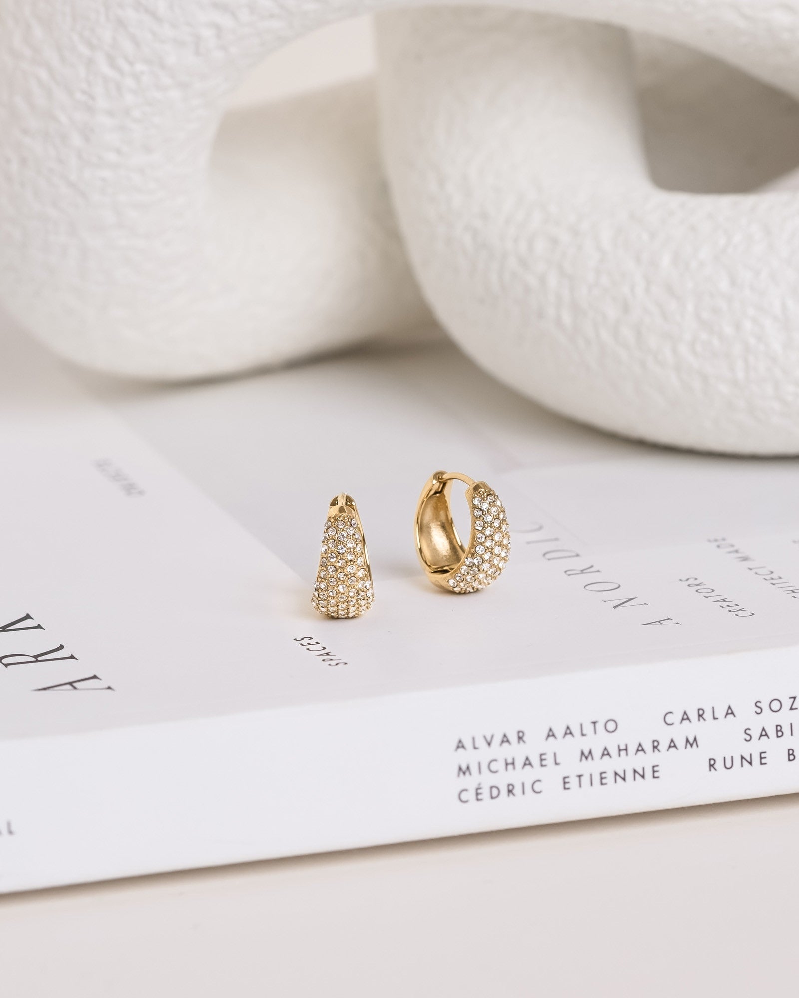 Pendientes de aro con piedras de circonita cúbica, diseñados para añadir elegancia atemporal y moderna a tu look. Hechos de acero inoxidable macizo con baño de oro PVD de 18K, son duraderos y resistentes al agua, asegurando que conservan su color con el tiempo.
